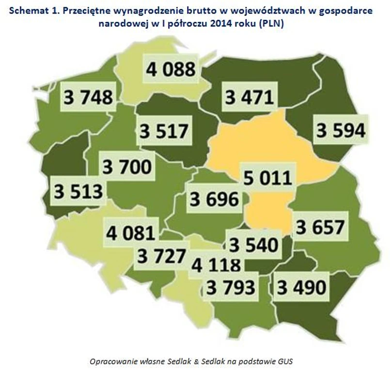 W pierwszym półroczu 2014 roku zarabialiśmy przeciętnie 3 817 PLN. Właśnie – przeciętnie. W podziale na województwa najwyższe zarobki odnotowano w mazowieckiem. Tam średnie wynagrodzenie wyniosło 5 011 PLN i stanowiło ponad 144% przeciętnego wynagrodzenia w warmińsko-mazurskim – województwie o najniższej średniej pensji. Powyżej średniej krajowej znalazły się, oprócz mazowieckiego, tylko trzy województwa: dolnośląskie (4 081 PLN), pomorskie (4 088 PLN) oraz śląskie (4 188 PLN). Co ciekawe, choć województwo opolskie jest dopiero na 7. miejscu pod względem wysokości zarobków, to jednocześnie mieszkańcy tego województwa są najbardziej, zaraz po mieszkańcach mazowieckiego, zadowoleni ze swojej sytuacji materialnej.