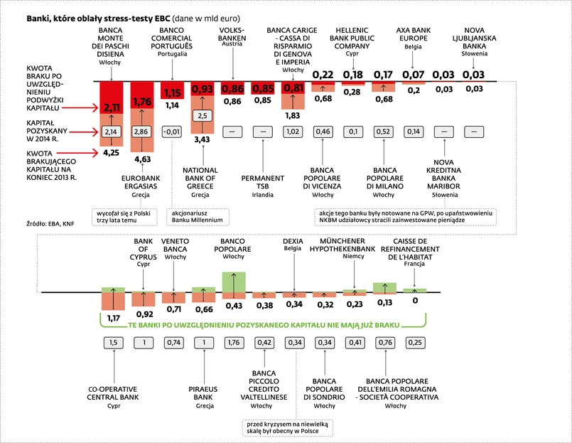 W ramach badania EBC pod lupę wzięto 130 banków. 24 z nich uzyskały wynik negatywny. Gdyby w strefie euro doszło do wyraźnej recesji (a takie właśnie założenie było fundamentem scenariusza szokowego), to poniesione straty zjadłyby im tyle kapitału, że współczynnik wypłacalności CET1 obliczany dla najpewniejszych kapitałów spadłby poniżej wymaganego minimum 5,5 proc. (w normalnych warunkach to minimum wynosi 8 proc.). W sumie według stanu na koniec 2013 r. brakowało im 24,2 mld euro. Dużą część tej kwoty udało im się jednak już zebrać, obecnie z niedoborem zostaje tylko 13 europejskich instytucji, którym brakuje 9,2 mld euro.