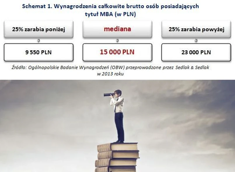 Spośród menedżerów posiadających tytuł MBA, 25 proc. najlepiej wynagradzanych zarabiało w 2013 roku powyżej 23 000 PLN brutto miesięcznie. Z kolei najsłabiej opłacane 25 proc. absolwentów MBA zarabiało poniżej 9 550 PLN brutto miesięcznie.