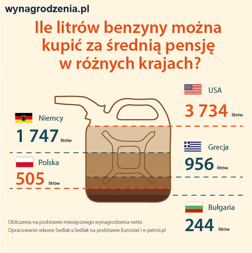 W gorszej sytuacji niż Polacy są mieszkańcy Słowacji i Bułgarii, którzy za swoje wynagrodzenie mogą nabyć odpowiednio 475 i 244 litrów benzyny. Wysoką siłą nabywczą mogą pochwalić się mieszkańcy Niemiec i Luksemburga. Nie wynika to z niskiej ceny paliwa, która jest porównywalna z funkcjonującą na rynku polskim, lecz z wysokich dochodów mieszkańców tych państw. Przeciętny mieszkaniec Luksemburga zarabia 3 664 EUR netto miesięcznie, Niemiec 2 601 EUR, podczas gdy Polak zarabia jedynie 635 EUR.