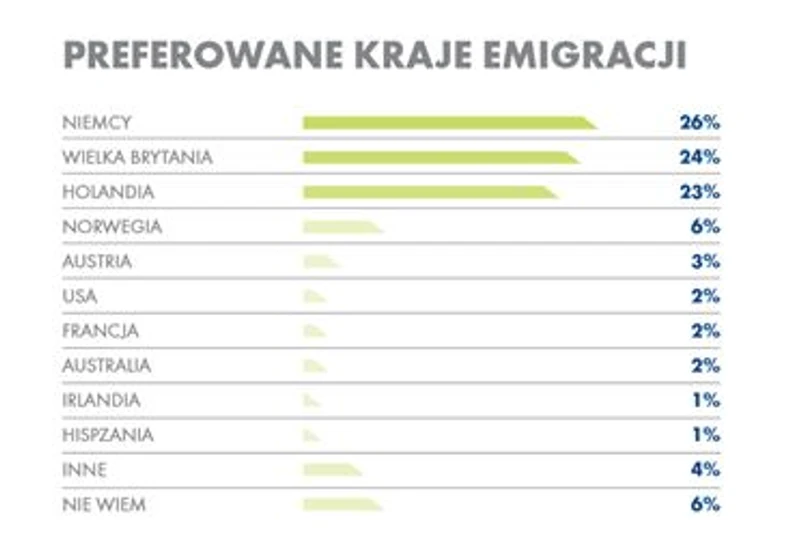 Z raportu Work Service wynika, że największą popularnością jako preferowane kraje emigracji cieszą się Niemcy, Wielka Brytania i Holandia (odpowiednio 26, 24 i 23 proc.). Już znacznie mniej chętnie planujący emigrację wyjechaliby do Norwegii (6 proc.), Austrii (3 proc.) czy USA lub Francji (po 2 proc.).