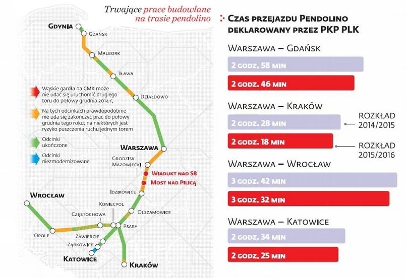 Na miesiąc przed inauguracją prawie na jednej czwartej długości linii na południe od Warszawy pociągi muszą kursować jednym torem. To bardzo niepokojące, bo na niej „wiszą” trzy kluczowe relacje Pendolino: do Krakowa, Katowic i Wrocławia. Niewiele lepiej jest na odcinku północnym, gdzie zamknięty jest jeden tor, m.in. w rejonie Działdowa i Malborka. Nie ma też pewności, czy gdziekolwiek uda się rozpędzić powyżej obecnej prędkości 160 km/h. Dodatkowo poważne problemy może spowodować niesprawdzony w praktyce system sterowania ruchem ERTMS.
