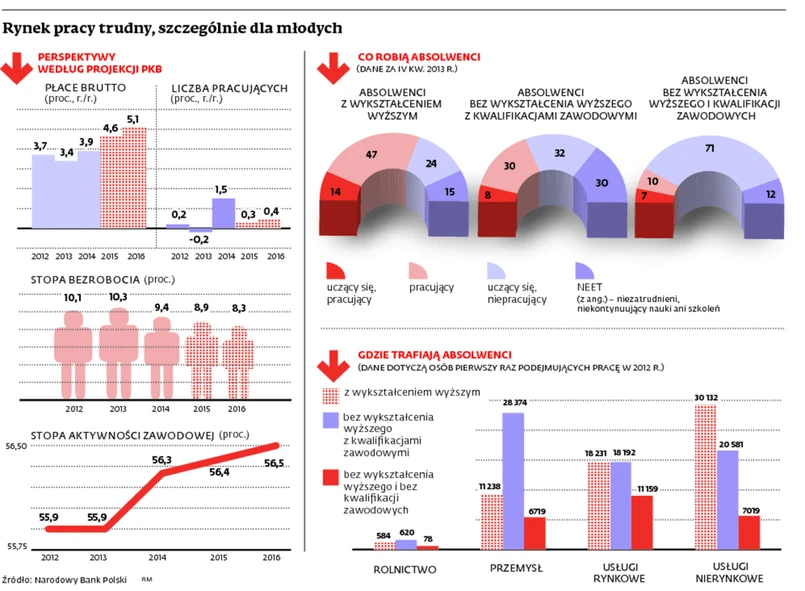 Zbyt mało zauważanym problemem naszego rynku pracy jest według Tyrowicz to, że młodzi ludzie nie mogą łączyć pracy z nauką. – U nas robić to mogą w praktyce tylko absolwenci studiów licencjackich. W Niemczech na przykład możliwe są porozumienia między szkołą i pracodawcą: trzy dni na naukę, trzy są do dyspozycji pracodawcy. Po drugie, trzeba upowszechnić dostęp do nieodpłatnego wykształcenia na poziomie uniwersyteckim. W innych krajach uczelnie publiczne, ponieważ są dotowane, mają obowiązek otwierania filii w mniejszych miastach, gdzie prowadzą działalność misyjną. W Polsce uczelnie publiczne w filiach prowadzą często odpłatne studia – wskazuje Joanna Tyrowicz.