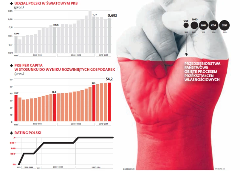 W rzeczywistości tej wiedzy nie było tez na Zachodzie – ani w MFW, ani nigdzie indziej. Wymagane zmiany w gospodarce znacznie wychodziły poza nasze doświadczenie związane z makroekonomia. Na przykład z Wielkiej Brytanii przyjechali eksperci, którzy tłumaczyli, jak przeprowadzano prywatyzacje za rządów Margaret Thatcher. Ale ich doświadczenie – sprzedaży dużych państwowych firm w najbardziej stabilnym na świecie otoczeniu prawnym, opartej na wycenie aktywów w jasnych warunkach ekonomicznych i finansowych – nie miało wiele wspólnego z wyzwaniami, przed jakimi stawały kraje środkowo-wschodniej Europy – opowiadał Lipton. Skutek? Reformy musiały bolec i zabolały. Popełniono niejeden błąd. Ale w rankingu bogactwa powoli pniemy się w górę. W 2013 r. byliśmy na 56. miejscu. Szwajcaria jest od nas już „tylko” sześc razy lepsza (obecny lider – Luksemburg – osiem razy).