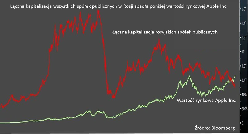 Wartość rosyjskich akcji spółek notowanych na giełdzie spadła w tym roku o 234 mld dol. do 531 mld dol. Tymczasem papiery Apple zyskały w tym czasie na wartości 147 mld dol. i dziś ich kapitalizacja sięga 652 mld dol. – wynika z danych Bloomberga.