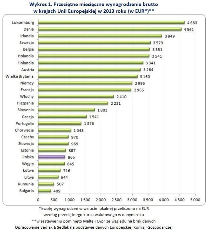 Polacy w tym samym roku otrzymywali średnie miesięczne wynagrodzenie brutto w wysokości 865 EUR. Niewiele mniej dostają Węgrzy - przeciętnie 845 EUR. Choć zarobki w naszym kraju są relatywnie niskie, to i tak znacznie przewyższają pensje Litwinów (644 EUR), Łotyszy (716 EUR), Rumunów (507 EUR) i Bułgarów (409 EUR).