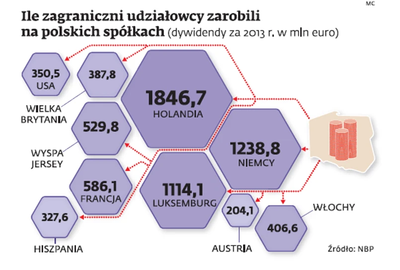 Z danych NBP wynika, że dochody zagranicznych właścicieli polskich firm wyniosły w ub.r. 13,7 mld euro. Stanowiły 8,6 proc. całkowitej kwoty zaangażowania w naszym kraju. W porównaniu z 2012 r. zyskowność inwestycji w Polsce nieco się poprawiła – wówczas było to 7,9 proc. O ile w 2012 r. dywidendy stanowiły 51 proc. dochodów inwestorów z polskich filii (reszta to odsetki od pożyczek udzielonych działającym u nas firmom, a także reinwestowane zyski – te pieniądze zostają w kraju), o tyle w ub.r. było to już 57 proc.