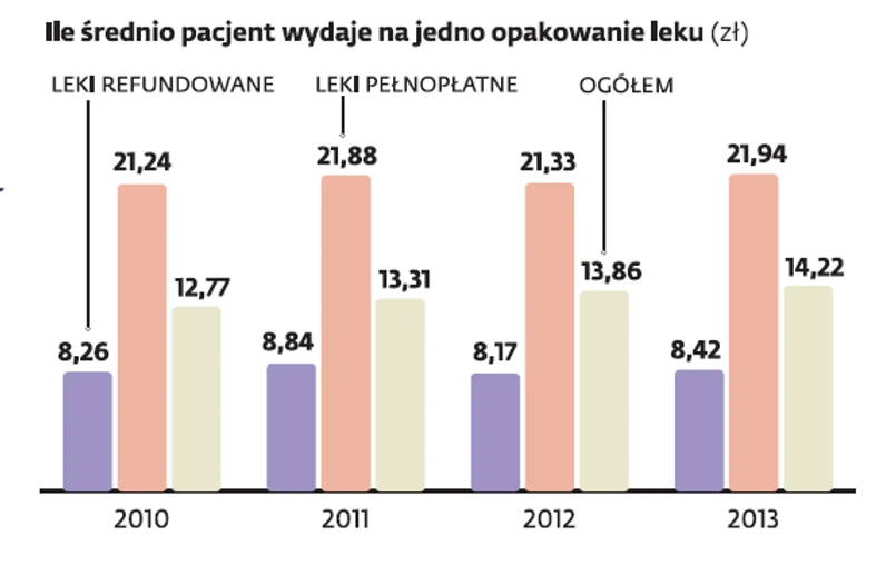 Rosną także ceny leków pełnopłatnych – jak wskazują analizy IMS Health i Sequence, w 2013 r. o ponad 60 gr na opakowaniu w porównaniu z rokiem 2012, na początku którego weszła w życie nowa ustawa. A skoro spada liczba preparatów, do których dopłaca państwo, ludzie są zmuszeni kupować więcej tych, za które płacą 100 proc. ceny. Poza tym na sprzedaży leków bez ulg w cenie straty odbijają sobie apteki i hurtownie, którym obcięto przy okazji wprowadzania nowych przepisów marże na te refundowane.