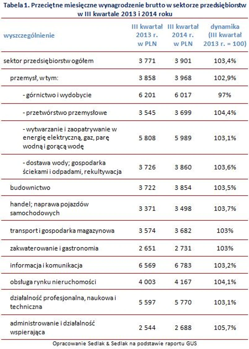 Przeciętne miesięczne wynagrodzenie brutto w sektorze przedsiębiorstw w III kwartale 2014 roku wzrosło o 3,4% w stosunku do analogicznego okresu ubiegłego roku – podaje Główny Urząd Statystyczny. Na koniec września wyniosło ono 3 901 PLN. W porównaniu z dwoma poprzednimi kwartałami, wzrost realnej płacy zwolnił i wyniósł 3,5% w odniesieniu do roku poprzedniego. W I kwartale 2014 roku wzrost ten wynosił 3,7% a w II kwartale 3,8%.