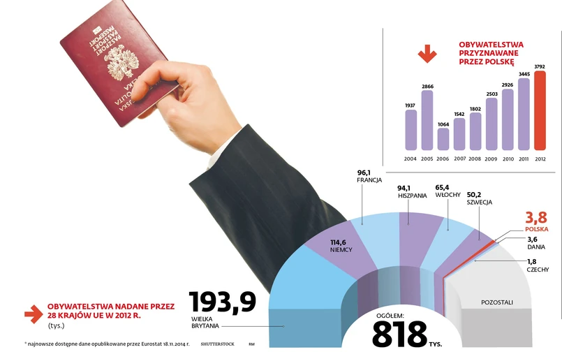 Wśród nacji ubiegających się o obywatelstwa innych krajów UE coraz więcej jest Polaków. W 2012 r. było to rekordowe 12,8 tys. Najczęściej jako nową ojczyznę wybieramy Niemcy. Ale w ostatnich latach radykalnie wzrosła liczba obywatelstw nadawanych Polakom w Wielkiej Brytanii i Irlandii. Jest to związane z wielką falą emigracji i tym, że coraz większa liczba naszych rodaków nie zamierza wrócić nad Wisłę. Z kolei nacją, dla której atrakcyjny jest paszport polski, są Ukraińcy.