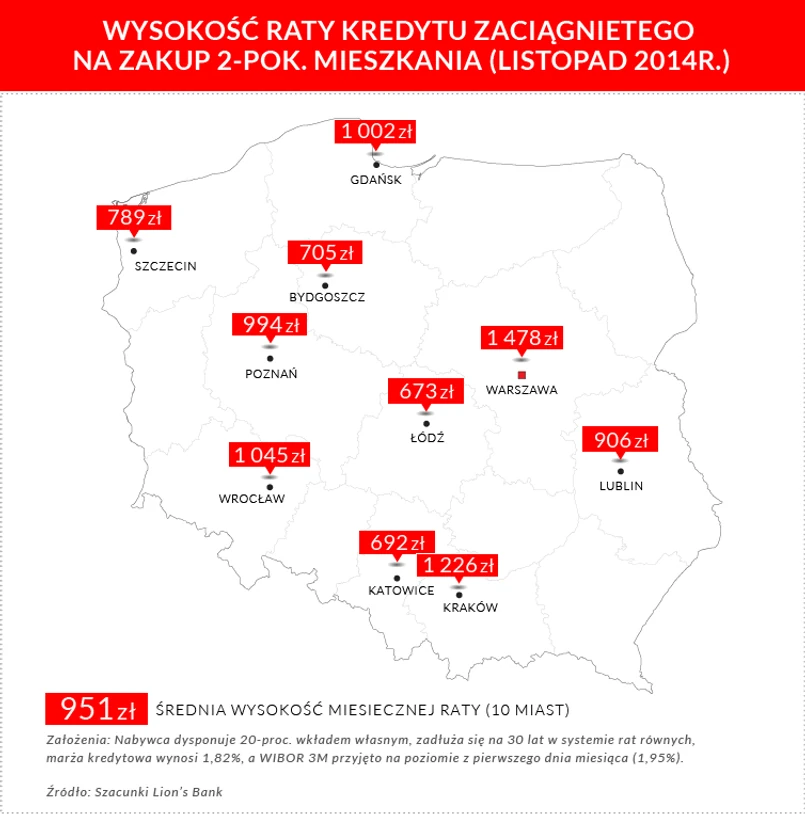 Dziś jednak przeciętna rata kredytu zaciągniętego na 30 lat z 20-proc. wkładem własnym na popularne dwupokojowe mieszkanie w jednym z 10 największych polskich miast wynosi średnio 951 zł miesięcznie. W przypadku kawalerek byłoby to 571 zł, a trzypokojowych lokali 1426 zł miesięcznie.