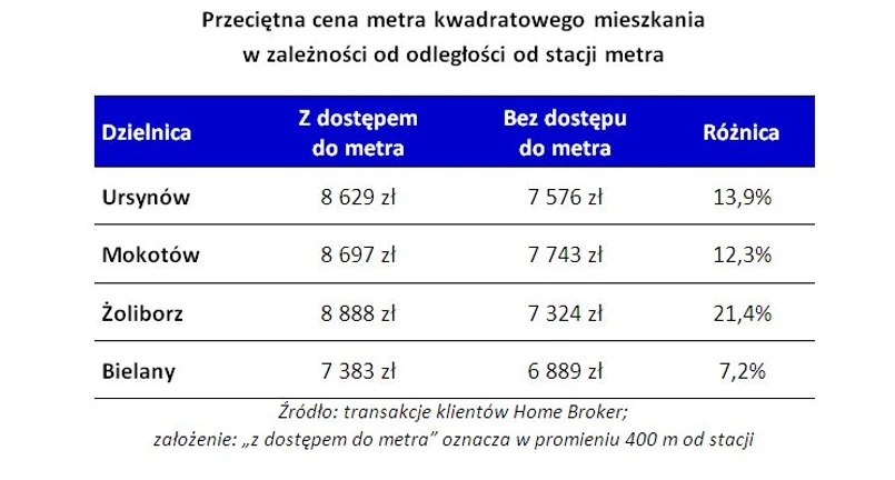 Z danych z transakcji klientów Home Broker wynika, że na Ursynowie metr mieszkania położonego nie dalej niż 5 min. marszu od stacji metra kosztuje przeciętnie 8629 zł. Jest to jednak trzecia największa dzielnica w mieście (większa niż całe Krosno czy Słupsk) i oferta nieruchomości jest bardzo zróżnicowana. Już oddalenie się od stacji metra o 600-800 metrów powoduje spadek cen mieszkań. Przeciętna cena transakcyjna mieszkania bez bliskiego dostępu stacji metra to 7576 zł za mkw. To oznacza, że mieszkania przy Ursynowskim metrze są droższe o 13,9 proc.