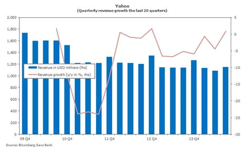 Działalność reklamowa Yahoo, z wyłączeniem środków pieniężnych i wartości rynkowej Yahoo Japan i Alibaby, nie jest wysoko wyceniana na Wall Street. W istocie stosowane tam mnożniki zerowego wzrostu to zawoalowane wotum nieufności wobec planów Mayer. Co do zasady, inwestowanie w Yahoo to w większości przypadków inwestowanie w spółkę Alibaba, z potencjałem wzrostu w przypadku nagłej poprawy wyników w ramach prowadzonej obecnie działalności reklamowej.