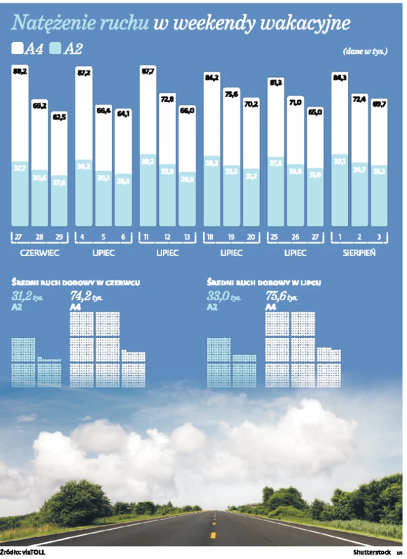 Według naszych ustaleń do rozmowy dojdzie w poniedziałek, ale jest obawa, że spór się przeciągnie. – Jeśli nie uda się sprowadzić z powrotem dodatkowych pracowników na A4 w okresie świątecznym i noworocznym, kiedy na drogach notowany jest zwiększony ruch, korek nie będzie miał końca – usłyszeliśmy nieoficjalnie. Średni dzienny ruch na A4 wynosi 60–70 tys. aut. To dwukrotnie więcej niż na A2. W szczytowych momentach przekracza nawet 90 tys. Średni przyrost ruchu na A4 rok do roku wynosi 8 proc.