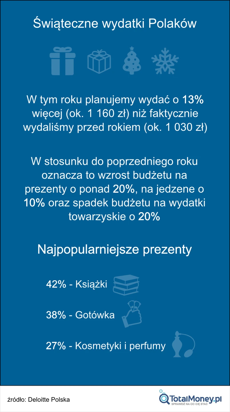 Z najnowszej edycji badania wydatków świątecznych firmy doradczej Deloitte wynika, że przeciętna polska rodzina jest gotowa przeznaczyć na organizację świąt 277 euro (ok. 1 160 zł). To prawie o 13% więcej niż faktycznie wydaliśmy przed rokiem (ok. 1 030 zł). Pod tym względem jesteśmy największymi optymistami wśród badanych krajów (16 europejskich i RPA). Nieznaczny wzrost wydatków świątecznych planują także Rosjanie (o 0,2% do 295 euro).