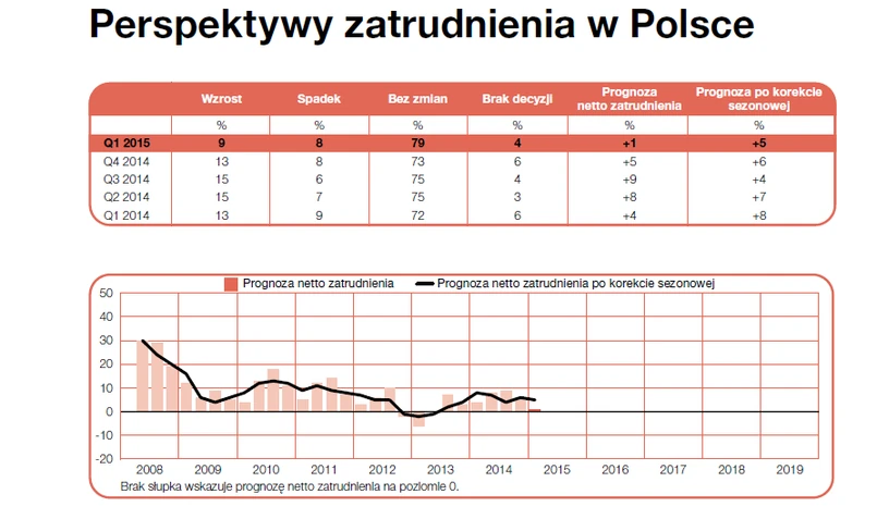 Tzw. prognoza netto zatrudnienia (wyrażona w proc. różnica między liczbą pracodawców przewidujących wzrost całkowitego zatrudnienia a liczbą pracodawców deklarujących jego spadek) wyniosła dla Polski plus 1 proc., natomiast po korekcie sezonowej wyniosła plus 5 proc. Była więc o 3 pkt. proc. niższa niż przed rokiem.