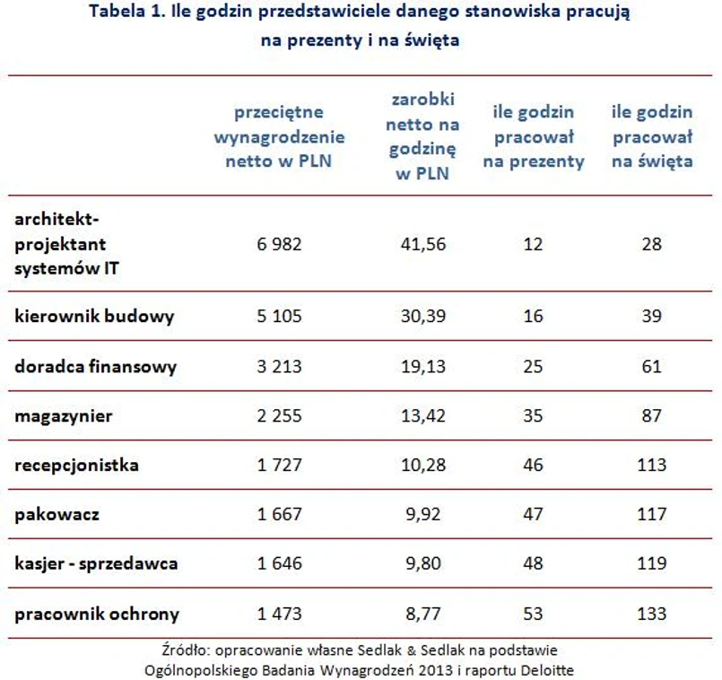Na przeciętną świąteczną paczkę najszybciej zarobił projektant systemów IT. Otrzymywał on średnio miesięcznie 6 982 PLN netto i żeby kupić prezenty musiał pracować 12 godzin. Kierownik budowy zarabiał przeciętnie ponad 30 PLN netto na godzinę. Na same upominki pracował więc dwa dni. Magazynier, chcąc zrobić bliskim niespodziankę musiał przepracować 35 h, recepcjonistka 46 h, pakowacz – 47 h, a kasjer sprzedawca 48 h. Najmniej w zestawieniu zarabiał pracownik ochrony. Przy przeciętnym wynagrodzeniu 8,77 PLN netto na godzinę musiał on przepracować 53 godziny, aby zarobić na świąteczne prezenty. To ponad 4 razy dłużej niż wynosił czas pracy projektanta systemów IT.