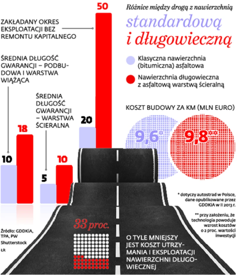 Eksperci potwierdzają, że rozwiązanie nie jest zarezerwowane dla jednej firmy i jest powszechnie znane. – Model konstrukcji długowiecznej powstał w USA, gdzie jest już sporo takich odcinków. Trwają też testy takich rozwiązań m.in. w Chinach – tłumaczy prof. Piotr Radziszewski z Politechniki Warszawskiej. Oczywiście każde rozwiązanie musi być dostosowane do miejscowych warunków atmosferycznych. A my w Polsce mamy jeden z najgorszych klimatów na świecie dla nawierzchni drogowej: średnio 120 razy rocznie skala termometru przechodzi przez O, co jest rujnujące dla nawierzchni.
