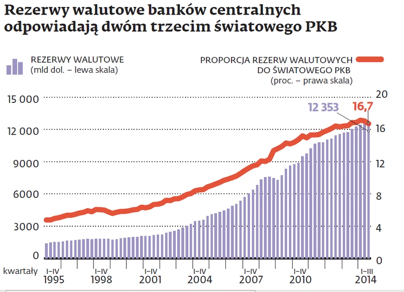 Do niedawna rezerwy walutowe banków centralnych szybko rosły. W ostatnich miesiącach trend się zatrzymał, co było spowodowane m.in. umocnieniem dolara, które spowodowało, że zmniejszyła się wartość tej części rezerw, które były utrzymywane w innych walutach. Dodatkowo spadały ceny złota, które również jest często składnikiem rezerw banków centralnych. Możliwe jednak, że rezerwy banków centralnych nie będą już rosły.