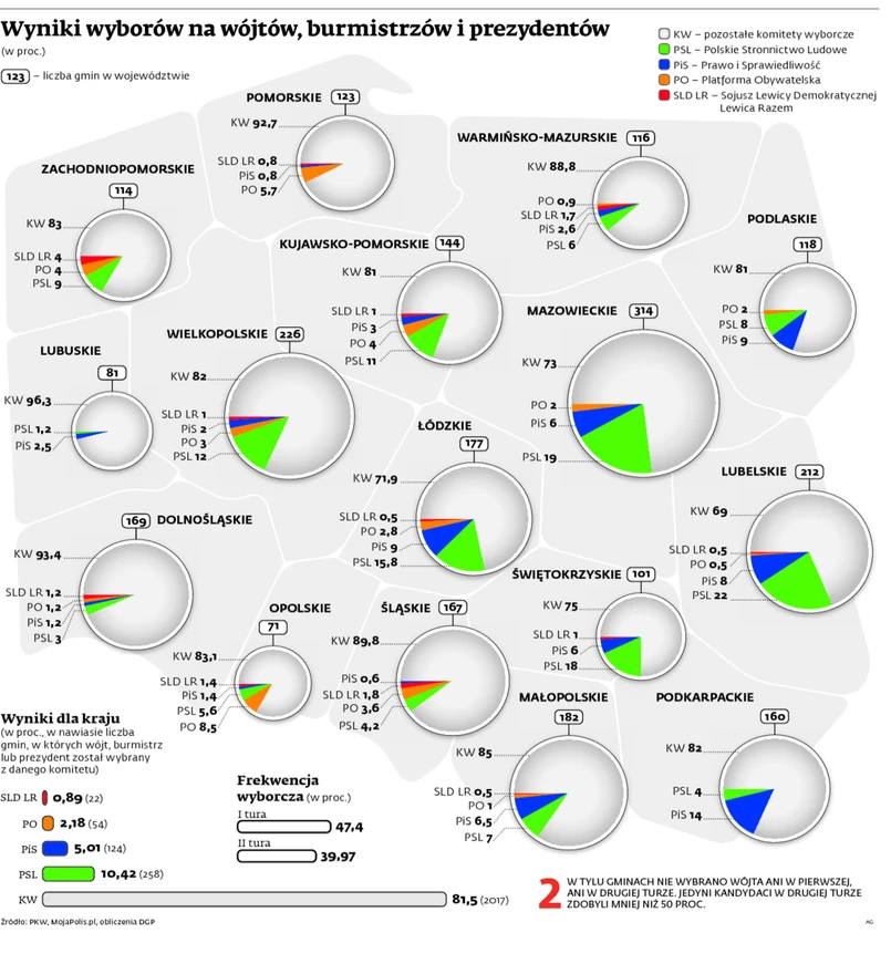Gwoli przypomnienia: wybieraliśmy przede wszystkim radnych do rad gmin i powiatów oraz wójtów, burmistrzów i prezydentów miast, czyli władzę wykonawczą na szczeblu lokalnym. Przyjrzeliśmy się właśnie tym ostatnim wynikom. W największej liczbie gmin (jest ich w Polsce prawie 2,5 tys.) zwyciężyli kandydaci wystawieni przez lokalne bezpartyjne komitety wyborcze. W województwach lubuskim i dolnośląskim przedstawiciele komitetów bezpartyjnych będą rządzić w 96 proc. gmin, w uważanym za matecznik PO województwie pomorskim – aż w 93 proc. Z kolei najbardziej upartyjnione wybory lokalnych włodarzy były w lubelskim, mazowieckim i łódzkim. W tych regionach 3 na 10 nowych gospodarzy wygrało pod szyldem partyjnym.