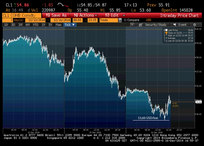 O godzinie 14:48 za baryłkę ropy WTI płacono 53,60 dol. Z kolei cena baryłki Brent o 13:01 dochodziła nawet do 58,50 dol. Tak niskich cen nie było od ponad pięciu lat.