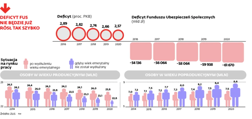 Na taki wynik duży wpływ miało wydłużenie przez rząd wieku emerytalnego. Jak pokazują autorzy prognozy, po tej zmianie w 2020 r. będzie aż o milion emerytów mniej, niż gdyby nadal obowiązywał wiek 60 lat dla kobiet i 65 dla mężczyzn. To powoduje oszczędności z tytułu wypłat świadczeń. – Spowolni bowiem odpływ osób z rynku pracy, ponieważ po zmianach trzeba będzie pracować dłużej – tłumaczy Tomasz Kaczor z Banku Gospodarstwa Krajowego. Znaczna część tych osób będzie płacić składki, z których finansowana jest wypłata emerytur. To tym ważniejsze, że w 2020 r. będzie mniej o 650 tys. osób w wieku produkcyjnym – a gdyby nie nastąpiło wydłużenie wieku emerytalnego, ubyłoby ich aż 1,4 mln.