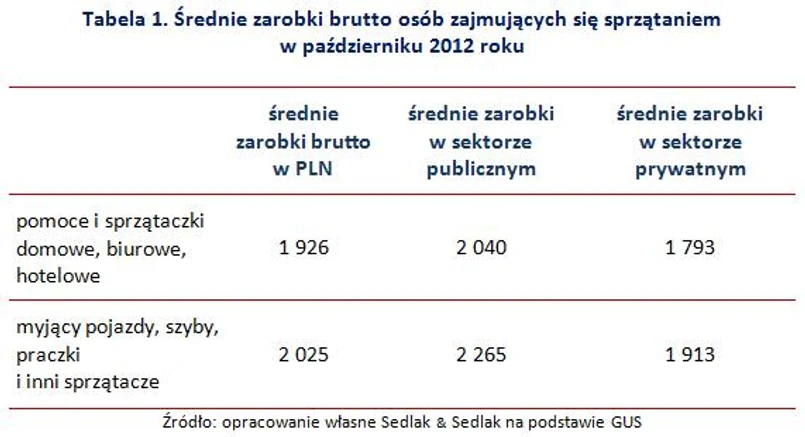 Przeciętne zarobki sprzątaczek i pomocy domowych wyniosły 1 926 PLN brutto. Myjący szyby i praczki zarabiali średnio o 99 PLN więcej, a ich płaca wyniosła 2 025 PLN – wynika z opublikowanego w 2014 roku badania Głównego Urzędu Statystycznego „Struktura wynagrodzeń według zawodów w październiku 2012 roku”. Średnia krajowa w tym czasie wyniosła 3 896 PLN brutto – wynagrodzenia osób sprzątających były więc od niej dwa razy niższe.