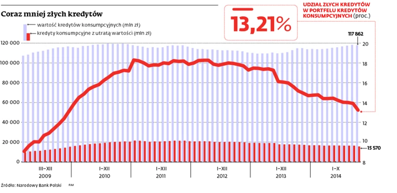 Na koniec października banki miały 15,6 mld zł niespłacanych kredytów konsumpcyjnych. Stanowiły one 13,2 proc. całego portfela takich należności. To wyraźnie mniej niż jeszcze rok temu. Wtedy klienci zalegali bankom na 17,4 mld zł, a i udział takich pożyczek w portfelu był większy (15,1 proc.).