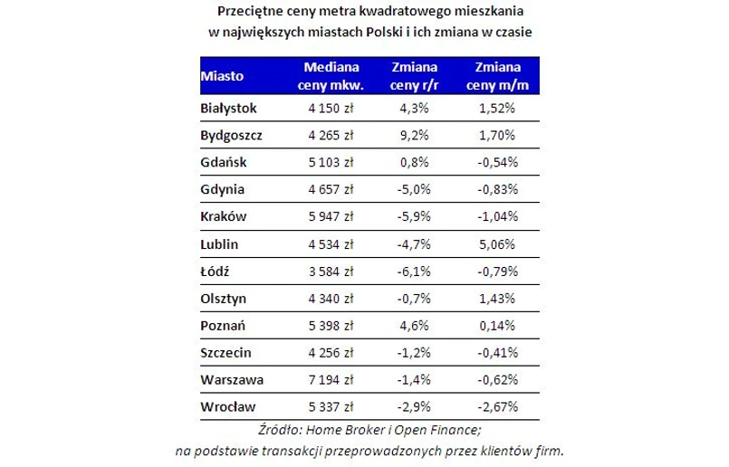 Pomijając kilka najważniejszych kurortów turystycznych, najwyższe nominalne ceny są niezmiennie w Warszawie. Mieszkania w stolicy najdroższe były w połowie 2008 r. gdy kupujący płacili średnio za metr kwadratowy 8 634 zł. Po sześciu latach przeciętne ceny są o prawie 17 proc. niższe, aktualny odczyt dla Warszawy to 7194 zł za mkw. Wg najnowszego notowania Indeksu Cen Transakcyjnych Home Broker i Open Finance w Krakowie za metr trzeba średnio zapłacić 5947 zł, a w Poznaniu 5398 zł. Z dużych miast najtańsze mieszkania są w Łodzi, przeciętnie 3584 zł za mkw., to niemal dokładnie połowa stawki warszawskiej.