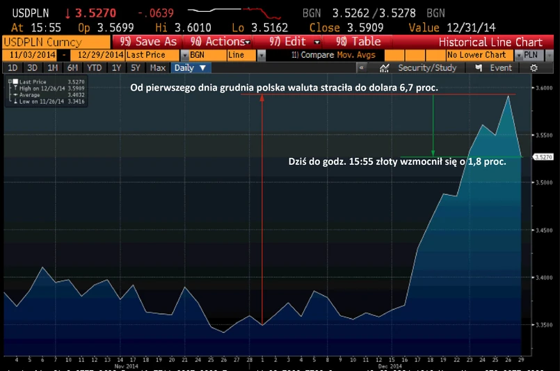 Od 1 do 26 grudnia polska waluta względem dolara straciła aż 6,7 proc. W tym samym okresie spadek wartości złotego do euro wyniósł 4,9 proc. 26 grudnia za jednego dolara płacono najwięcej o godzinie 13:19 – 3,6112 zł, zaś za 1 euro o godzinie 13:08 - 4,4000 zł. Tego samego dnia na zamknięciu za dolara płacono 3,5909 zł, zaś za euro 4,3788 zł.