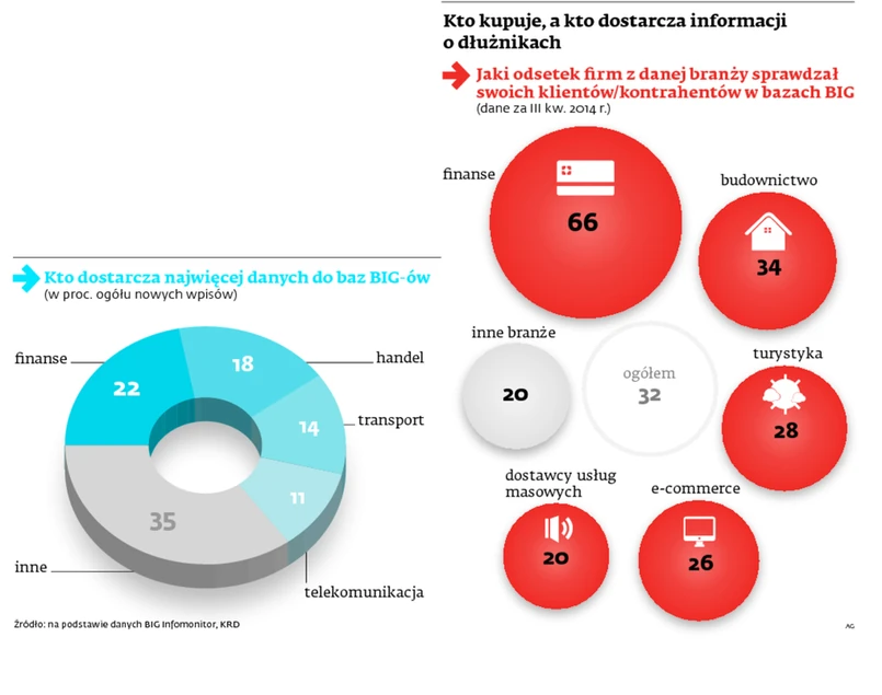 Ale jednocześnie przyznaje, że jest pewna dysproporcja między liczbą informacji pobieranych z baz przez sektor finansowy i dostarczanych do nich danych o własnych dłużnikach. Widać to zwłaszcza w zestawienia BIG-ów niepowiązanych kapitałowo z sektorem bankowym – jak właśnie KRD (w odróżnieniu od BIG Infomonitora, który jest własnością Związku Banków Polskich i BIK). Według jego informacji finanse dostarczyły niewiele ponad jedną piątą wszystkich nowych wpisów, niewiele więcej niż branża handlowa (18 proc.).