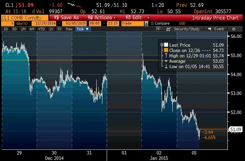 Krótko przed 16 ropa brent kosztowała 54,43 dolarów ale o 15 kosztowała 54,02 dolarów . Ropa WTI kosztuje 51,09 dolarów za baryłkę. Minimum, czyli 50,55 dolarów kurs notował o 14.40. Na zamknięciu 26 grudnia ropa brent kosztowała brent 59,45 dolarów , WTI 54,73 dolarów. W czasie gdy Rosjanie świętowali nowy rok (od 26 grudnia do ceny aktualnej) cena ropy Brent spadła o 9,1 proc. a Wti o 7,6 proc.