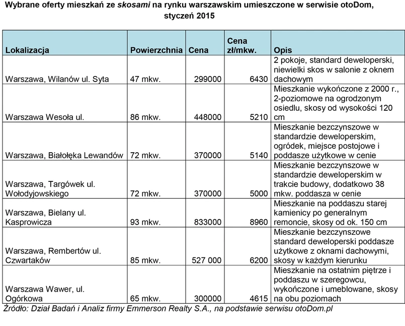 Reasumując – obecność skosów w mieszkaniu nie zawsze dyskryminuje ofertę sprzedaży, co więcej najczęściej kupujący takie mieszkania mogą liczyć na większą powierzchnię, którą otrzymują niejako dodatkowo do zwykłej powierzchni użytkowej. Specyfika mieszkań ze skosami powoduje jednak, iż odpowiednie zaplanowanie urządzenia pomieszczeń może okazać się kluczowym czynnikiem decydującym o atrakcyjności zakupu danego lokalu.