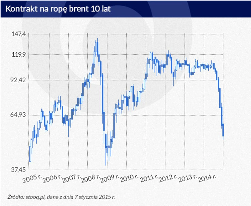 Latem ubiegłego roku cena ropy Brent na rynku dostaw natychmiastowych (spot) wahała się w okolicach 110 dolarów za baryłkę. Po pół roku, 30 grudnia 2014 r. baryłka kosztowała jedynie połowę tego, bo 57,86 dolarów, podczas gdy 10 lat wcześniej, w końcu grudnia 2004 r. płaciło się jedynie 39,8 dolarów. Na początku stycznia 2015 roku cena baryłki ropy Brent spadła poniżej 50 dolarów.