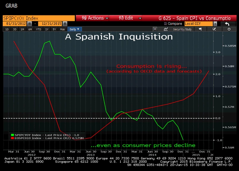 Zgodnie z ekonomicznymi teoriami, wydatki konsumentów powinny zostać niebawem drastycznie ograniczone. Jak to się ma do tego, co tak naprawdę dzieje się w realnym świecie, gdy pojawia się deflacja? Przykładem jest Hiszpania, w której inflacja znajdowała się poniżej zera przez sześć miesięcy z rzędu. Teoretycznie więc pół roku deflacji powinno zabić wydatki konsumentów. Wszyscy przecież czekali na dalszy spadek cen, prawda?