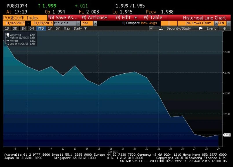 Od momentu ogłoszenia programu skupu obligacji przez Mario Draghiego trwa rajd na polskim złotym i obligacjach. W zeszłym tygodniu złoty umocnił się 0 2,5 proc. wobec euro – najmocniej od 2012 roku. Tymczasem rentowności 10-letnich obligacji złotowych spadły w czwartek do rekordowo niskiego poziomu 1,95 proc. W czwartek po południu złoty umacniał się o,8 proc. do 4,2117 za euro i radził sobie najlepiej wśród 24 walut rynków wschodzących monitorowanych przez Bloomberga.