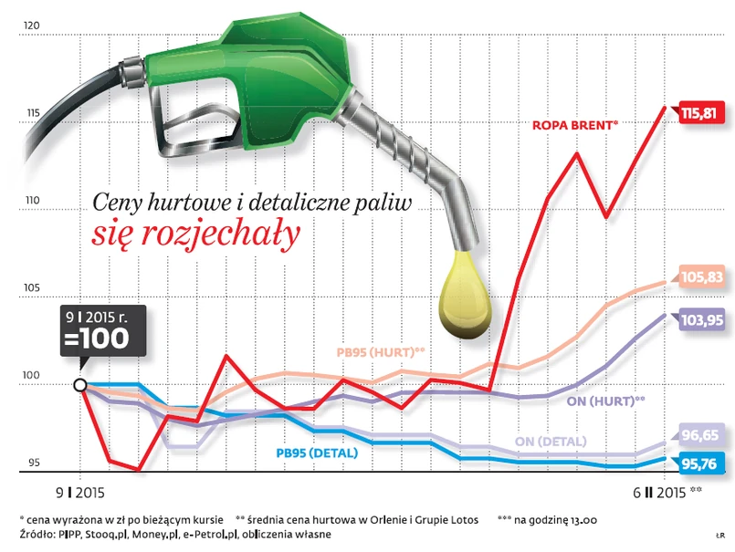 W ostatnich dniach oba polskie koncerny rafineryjne zaczęły jeszcze mocniej windować ceny hurtowe. Miało to miejsce na samym początku lutego, dosłownie dzień po tym, jak na ostatniej styczniowej sesji giełdowy kurs ropy brent skoczył o ponad 6 proc. – Zasadniczym powodem ostatnich wzrostów ceny surowca na świecie były najpewniej wieści o zamykaniu kolejnych odwiertów łupkowych w USA – wyjaśnia Pupacz.