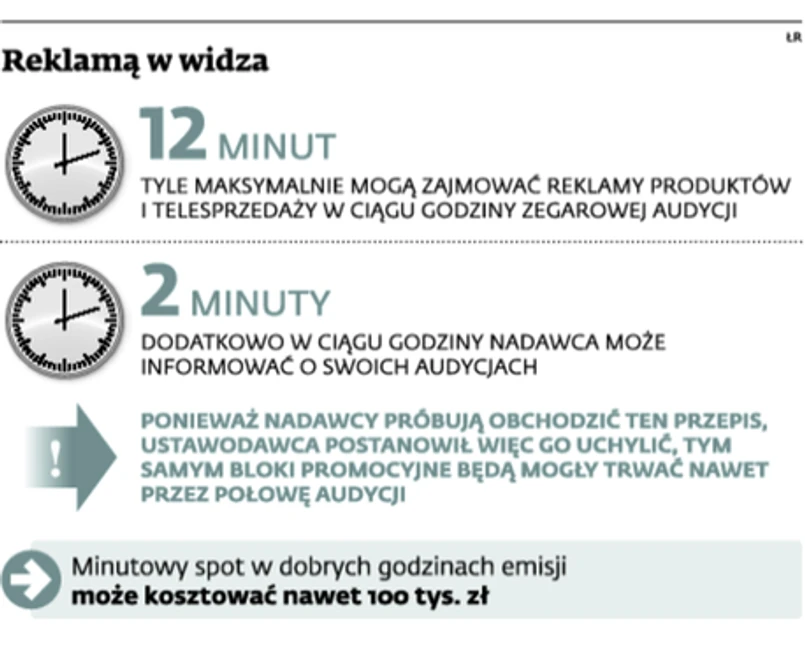 Obecnie nadawcy programów – czy to telewizyjnych, czy radiowych – mogą w ciągu godziny zegarowej wyemitować do 12 minut reklam. Skąd więc wrażenie, że przerwy w programach trwają dłużej? Stąd, że poza czasem przeznaczonym na emisję reklam nadawcy mogą także przez 2 minuty w ciągu godziny emitować informacje o własnych programach (np. zapowiedź serialu). Czynią to jednak w znacznie większym wymiarze, obchodząc niedoskonałe przepisy ustawy o radiofonii i telewizji (t.j. Dz.U. z 2011 r. nr 43, poz. 226). Nadawcy tworzą mianowicie oddzielne programy w praktyce przedstawiające ich ofertę. Takiego materiału telewizje nie wliczają do 2-minutowego limitu. A Krajowa Rada Radiofonii i Telewizji jest wobec takich praktyk bezradna.