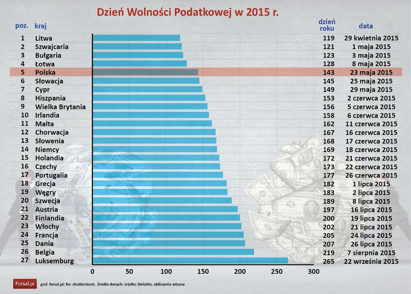 Jak obliczył czeski oddział Deloitte nasz kraj jest tu w czołówce. Wcześniej niż Polacy Dzień Wolności Podatkowej będą obchodzić tylko cztery europejskie nacje: Litwini, Łotysze, Bułgarzy i Szwajcarzy.
