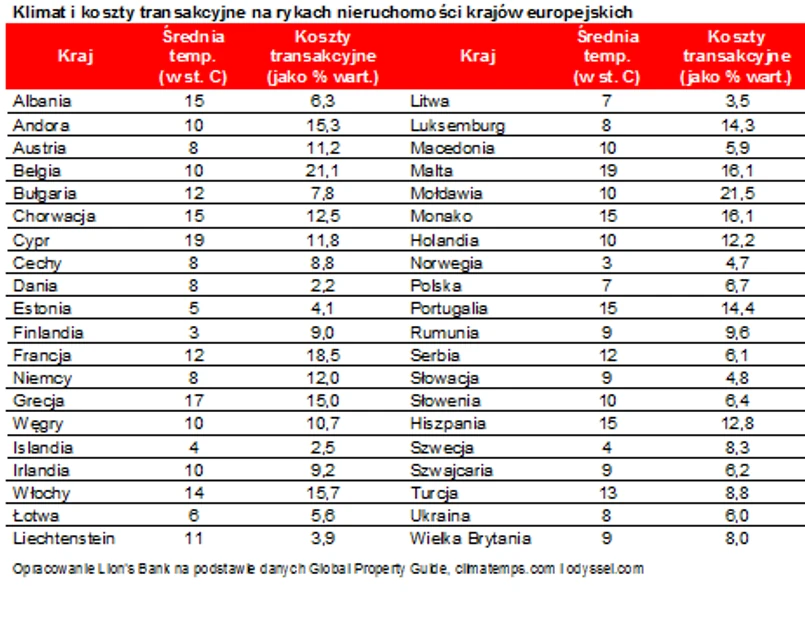 Te wydatki to jednak nie wszystko. Trzeba bowiem przygotować się także na dodatkowe koszty związane z zawarciem transakcji. Na koszty transakcyjne składają się koszty sądowe, podatki, opłaty notarialne i prowizje pośredników. Dane zebrane przez Lion’s Bank pokazują, że są one wyraźnie wyższe w krajach o cieplejszym klimacie. I tak najmniej niespodziewanych wydatków będzie miał nabywca w Danii (średnia roczna temperatura 8 st. C) i na Islandii (4 st. C). W obu tych krajach koszty transakcyjne portal GPG oszacował na mniej niż 3% wartości nieruchomości. Na kolejnych miejscach są Litwa, Liechtenstein, Estonia, Norwegia i Słowacja. We wszystkich tych krajach średnie koszty transakcyjne pochłaniają niecałe 5% wartości nieruchomości, podczas gdy tylko w Liechtensteinie średnia temperatura roczna jest dwucyfrowa.