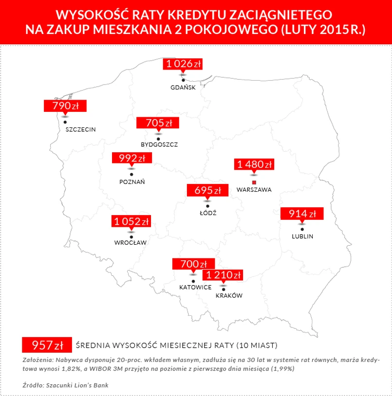 Jak te liczby wpływają na wysokość rat? Gdyby dziś zadłużyć się na 30 lat z 20-proc. wkładem własnym na popularne dwupokojowe mieszkanie w jednym z 10 największych polskich miast trzeba się liczyć z ratą na poziomie 957 zł (średnia dla badanych miast). W przypadku kawalerek byłoby to 574 zł, a trzypokojowych lokali 1435 zł miesięcznie.