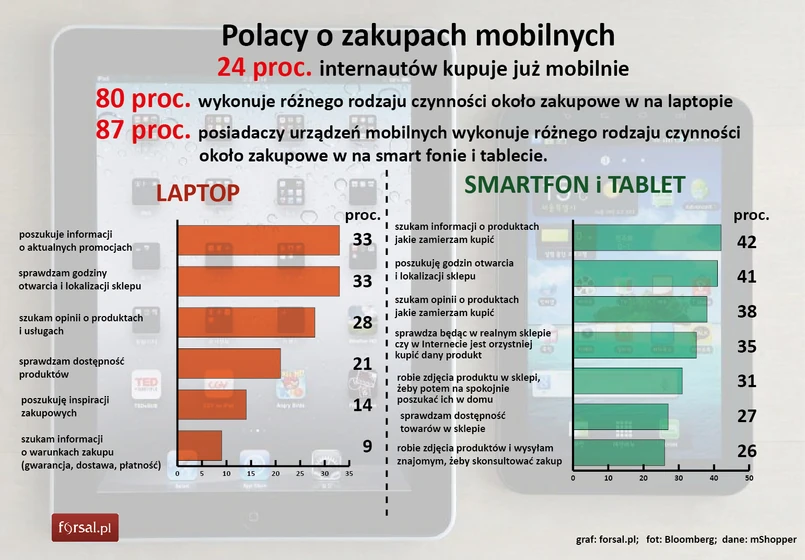 Z badania wynika także, że duża część internautów, wprawdzie kupuje na laptopie czy komputerze stacjonarnym, ale wcześniej wyszukuje produkty także na smart fonach czy tabletach. Jednak tam nie kończy transakcji. Zdaniem ekspertów wynika to faktu, że o ile konsumenci są otwarci na mobilne zakupy, to sklepy internetowe nie są do nich odpowiednio przygotowane. Badani wśród utrudnień wskazują przede wszystkim na niedostosowane do urządzeń mobilnych formularze zamówień, niewygodne strony i aplikacje (nieprzystosowane do posiadanego przez użytkownika urządzenia) oraz złej jakości zdjęcia produktów.