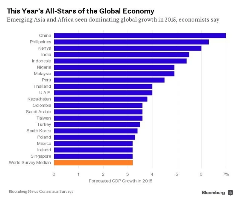 Gospodarki Chin, Filipin, Kenii, Indii i Indonezji, które razem tworzą ok.16 proc. globalnego PKB, wzrosną w tym roku o ponad 5 proc. Liderem będzie Państwo Środka, w którym wzrost PKB przekroczy 7 proc. Będzie to jednak wolniejszy wzrost niż w poprzednich latach. W ostatnim kwartale 2014 roku gospodarka Chin rosła o 7,3 proc. w ujęciu rocznym. Takie tempo wzrostu nie zadowala Chin. Ludowy Bank Chin zwiększa zakres środków stymulujących wzrost gospodarczy. W listopadzie władze monetarne wprowadziły pierwszą od 2012 roku obniżkę głównej stopy procentowej. W lutym zredukowano stopę depozytową.
