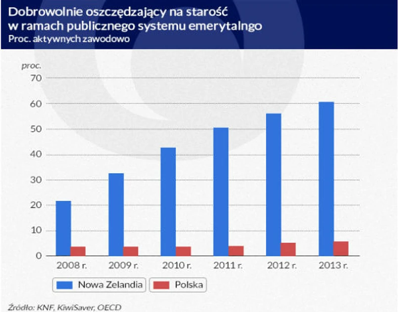 Mechanizm automatycznego zapisu zachęca ludzi do regularnego oszczędzania. W 2005 r. w Nowej Zelandii osoby dobrowolnie oszczędzające na emeryturę stanowiły niecałe 20 proc. aktywnych zawodowo. System KiwiSaver powstał w 2007 r. – dziś robi to ponad 60 proc. aktywnych zawodowo. W Polsce tylko ok. 5 proc. aktywnych zawodowo dobrowolnie odkłada na starość w ramach Pracowniczych Programów Emerytalnych (PPE), Indywidulanych Kont Emerytalnych (IKE), czy Indywidualnych Kont Zabezpieczenia Emerytalnego (IKZE). Wprowadzone w 2012 r. w Polsce IKZE nie doprowadziły do istotnego zwiększenia liczby oszczędzających (raczej spowodowały przejście z IKE do IKZE). KiwiSaver natomiast od początku działalności potroił liczbę dobrowolnie odkładających na emeryturę.