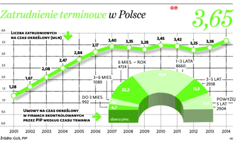 3,65 mln osób, które obecnie pracują na czas określony, zyska stabilniejsze warunki zatrudnienia. Jeszcze w tym roku uchwalone mają być przepisy skuteczniej ograniczające nadużywanie terminowych umów. Rządowy projekt nowelizacji k.p., który wkrótce ma trafić pod obrady Rady Ministrów, przewiduje, że zatrudnienie na czas określony nie będzie mogło trwać dłużej niż 33 miesiące. W tym czasie firma będzie mogła zawrzeć z pracownikiem maksymalnie trzy umowy terminowe. Zawarcie czwartej lub kontynuowanie pracy po przekroczeniu 33-miesięcznego limitu będzie równoznaczne z zawarciem umowy na czas nieokreślony, co wiąże się z zyskaniem stabilniejszego zatrudnienia (np. wypowiedzenie umowy stałej trzeba uzasadnić). Szkopuł w tym, że nowe obostrzenia – tak jak obecnie obowiązującą zasadę, że trzecia umowa terminowa przekształca się w stałą – będzie można obejść.