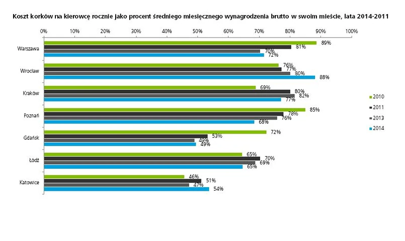 Korki i utrudnienia w ruchu drogowym w największych polskich miastach w 2014 r. kosztowały kierowców 3,6 mld zł – podaje Deloitte. Pracujący kierowcy w siedmiu największych miastach Polski tracili w korkach w 2014 r. średnio 13,7 mln zł dziennie (w porównaniu z 2013 r. oznacza to pogorszenie o ponad 5 proc.) Ale wzrost średnich wynagrodzeń w siedmiu analizowanych miastach na zbliżonym poziomie do kosztów korków oraz spadek cen paliw sprawił, że w ujęciu realnym koszt korków nieznacznie spadł i wynosił średnio 68 proc. miesięcznego wynagrodzenia w porównaniu z 70 proc. w r. 2013.