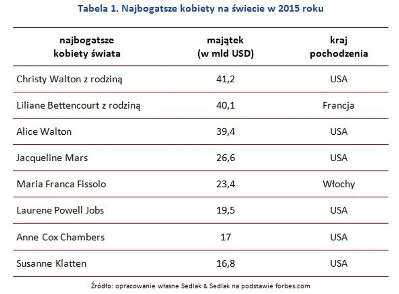 Majątek Christy Walton jest prawie dwukrotnie mniejszy niż pierwszego na liście Billa Gatesa, którego fortunę szacuje się na 79,2 mln USD. Drugie miejsce na podium wśród najbogatszych kobiet zajęła Liliane Bettencourt z rodziną. Francuzka ma 92 lata, jest córką chemika, który w 1907 roku założył L’Oreal. Pani Bettencourt wspólnie z rodziną posiada obecnie 33 proc. akcji koncernu. Ostatnie miejsce na podium z majątkiem 39,4 mld USD, zajmuje Alice Walton, córka założyciela Wal-Mart Stores Inc.
