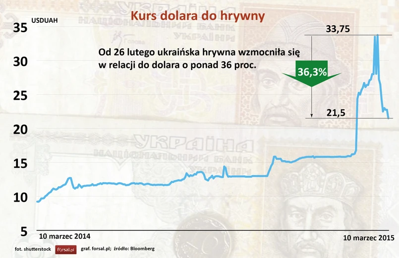 Choć kurs hrywny oficjalnie upłynniono w ubiegłym miesiącu, to jest on sztucznie utrzymywany po środowej decyzji o podniesieniu stopy refinansowej z poziomu 19,5 do 30 proc. oraz po wprowadzeniu kontroli obrotu walutami. Wprowadzone kontrole oznaczają m.in. zakaz sprzedaży walut przekraczających wartość 3000 hrywien; zakaz wypłacania z kont walutowych kwot o wartości większej niż 15 tys. hrywien; ograniczenia dla banków w zakresie zakupu obcych walut; nieustanne nękanie importerów, którzy próbują dokonać płatności poza Ukrainą.