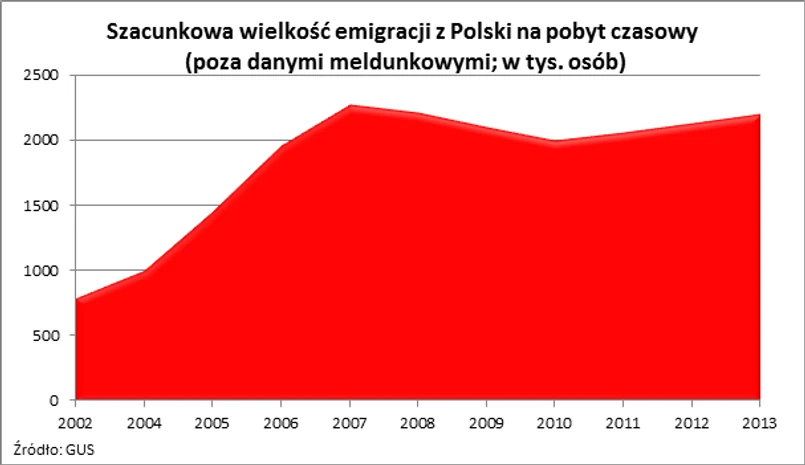 To mało w obliczu skali emigracji z kraju. W tym kontekście także można przytoczyć szacunki GUS. Wynika z nich na przykład, że liczba osób przebywających poza granicami kraju na pobyt czasowy wzrosła pomiędzy rokiem 2002 i 2011 aż o 1 274 tys. osób. O tyle zmienił się stan ludności przebywającej na czasowej emigracji. Liczba osób, która w tym czasie wyjechała z kraju może być znacznie wyższa, bo przecież Polacy nie tylko wyjeżdżali z kraju, ale też do niego wracali, a poza tym szacunki GUS nie uwzględniają w tym przypadku osób, które wyjechały z kraju na stałe – wymeldowując się.