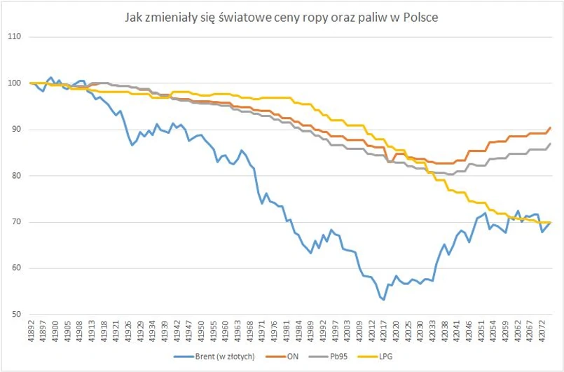 Przed miesiącem cena baryłki ropy Brent po raz pierwszy w tym roku przekroczyła 60 dol. Od tamtego czasu kurs tego surowca zachowuje się jednak stabilnie, co więcej w ostatnich dniach notowania wykazują nawet wyraźną tendencję spadkową. Tym tygodniu za baryłkę płacono już mniej niż 57 dol. Tymczasem w Polsce zarówno ceny hurtowe, jak i detaliczne benzyny oraz oleju napędowego od kilku tygodni stale rosną.